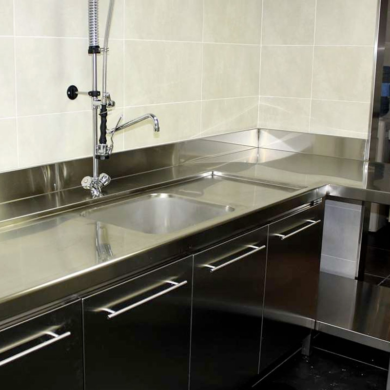 Algunos de los muebles más habituales en este tipo de cocinas con las mesas con fregadero de acero inoxidable. Son totalmente necesarios ya que sirven para fregar o aclarar los platos y vasos antes de pasarlos por el lavavajillas. Ha habido ocasiones en las que hemos tenido que fabricar un simple fregadero de acero inoxidable con patas, es decir, un fregadero con encimera y una estructura de cuatro patas. Los fregaderos de acero inoxidable sobre encimera se fabrican con una pliegue en forma de vierte aguas, que sirve para hacer que el agua acaba cayendo sobre el fregadero y que sirve además como guía para las bandejas que portan los vasos y platos y que acaban dentro del lavavajillas.