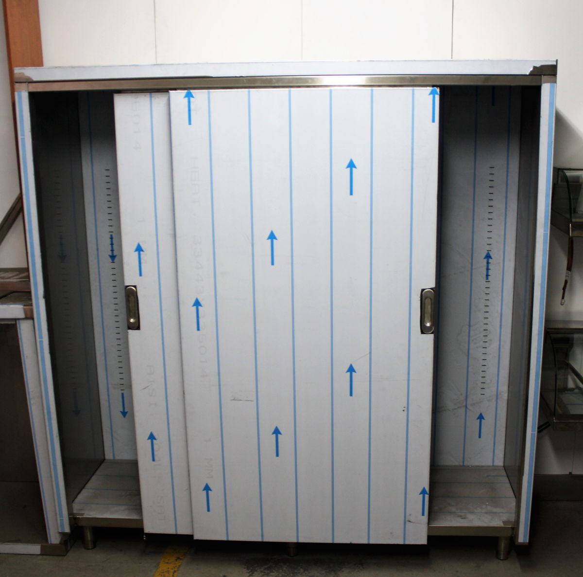 Armario vajillero de gran capacidad fabricado en acero inoxidable con estantes interiores.