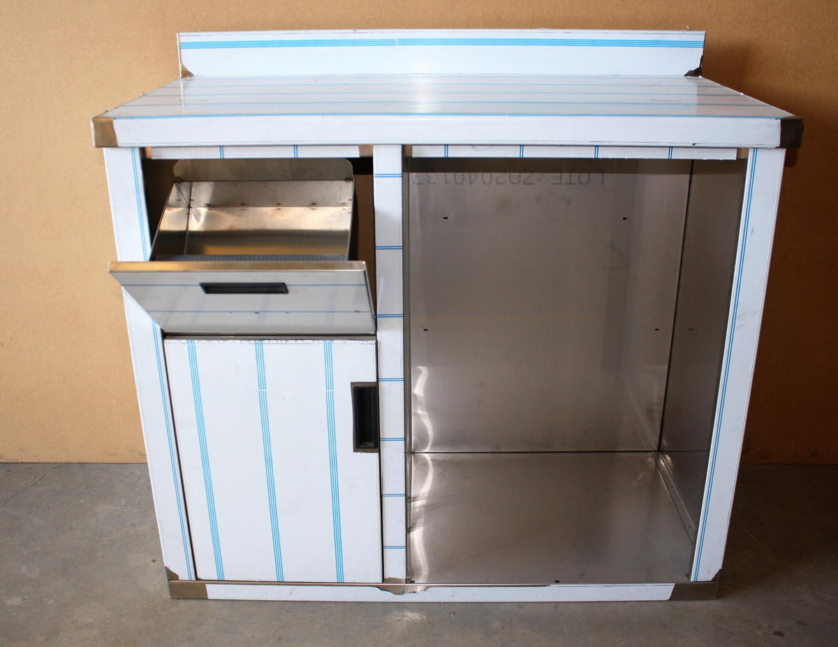 Mueble cafetero fabricado en acero inoxidable, con posero, puerta abatible y estantes.